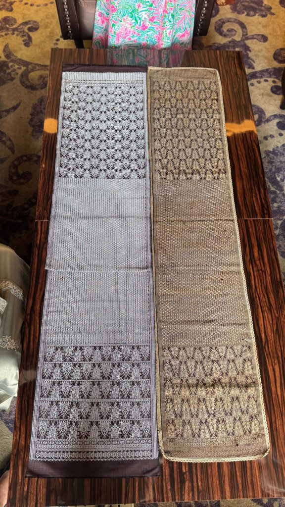 Ini juga tantangan tersendiri. Benang emas atau perak zaman dahulu sudah tidak diproduksi lagi. Kami menganalisa kain tua untuk melihat jenis benang apa yang digunakan. Kadang, kami menggunakan benang emas “jabutan”, yaitu diambil dari kain-kain kuno yang rusak. Karena benang tersebut masih mengandung unsur emas, hasil replikanya bisa mendekati versi aslinya.