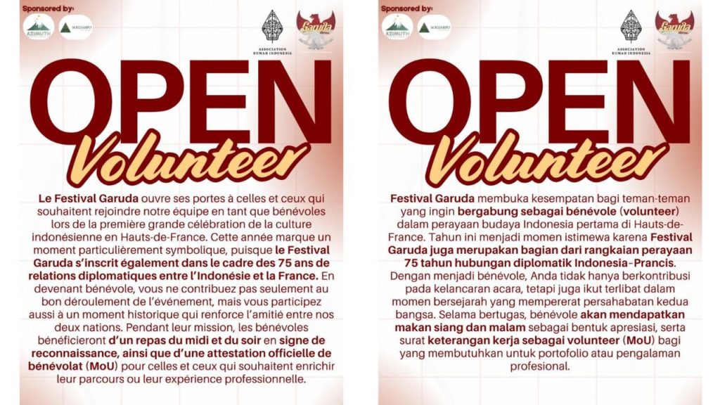 Ya, sukarelawan tidak hanya terdiri oleh WNI dan keluarganya. Ada banyak warga Prancis dan ada warga negara lainnya! Kebanyakan adalah mahasiswa di Lille. Tapi ada juga yang “sekedar” pecinta Indonesia. Entah karena pernah berkunjung, pernah tinggal, atau karena jatuh hati pada WNI. Ehem.