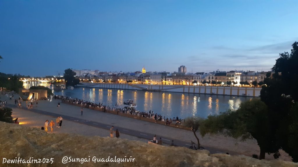 Sevilla memang kota yang cantik. Tapi untuk mengagumi setiap sudutnya tidak akan cukup sehari saja. Setelah tidur siang di hotel, sore harinya kami berjalan-jalan menyusuri Sungai Guadalquivir. Banyak muda-mudi dan keluarga yang menikmati suasana tepi sungai sambil bercengkerama atau berdansa. Sungai ini membentang di sepanjang Andalusia dari Pegunungan Sierra de Cazorla sampai ke Teluk Cadiz di barat daya Spanyol, melewati Cordoba dan Sevilla. Dikenal dengan nama “Al-Wadi Al-Kabir” pada zaman kekhalifahan Islam, Sungai Guadalquivir sudah digunakan sebagai jalur transportasi air sejak era Romawi. Di pinggir sungai terdapat menara pengawas Torre del Oro yang dibangun pada masa kekhalifahan Al-Muwahhid.