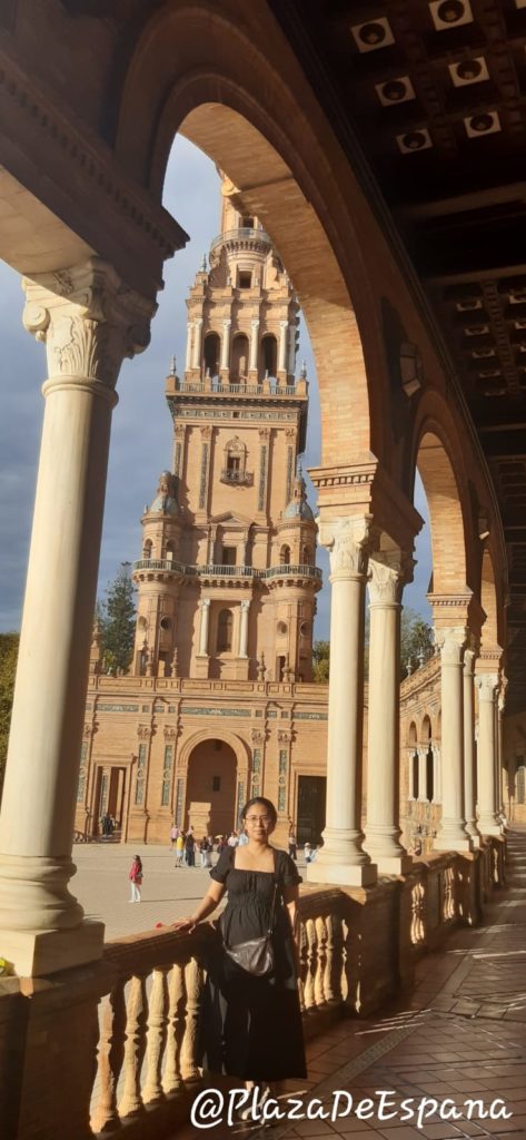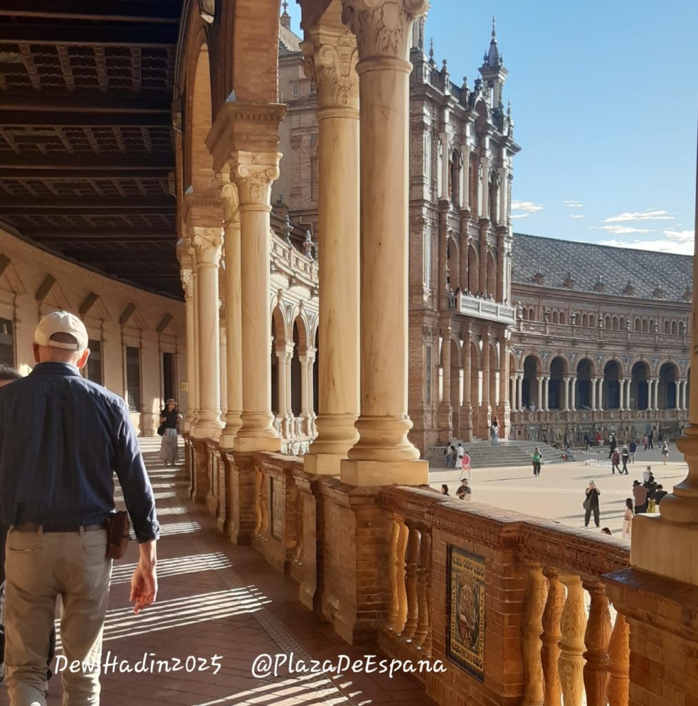 Kami melanjutkan perjalanan, kali ini menuju Plaza de España. Plaza de España adalah sebuah lapangan besar di Taman Parque María Luisa yang dibangun dalam rangka Pameran Iberia-Amerika pada tahun 1928. Lapangan itu dikelilingi bangunan megah setengah lingkaran dengan arsitektur yang mengadopsi gaya Moor, Barok, dan Renaisans. Bangunan itu memang mengagumkan dengan plafon yang tinggi, tegel dan pilar-pilar yang cantik, tangga, serta balkon-balkon terbuka. Saking megah dan cantiknya, Plaza de España pernah menjadi lokasi syuting film “Lawrence of Arabia” (1962) dan “Star Wars” (2002).