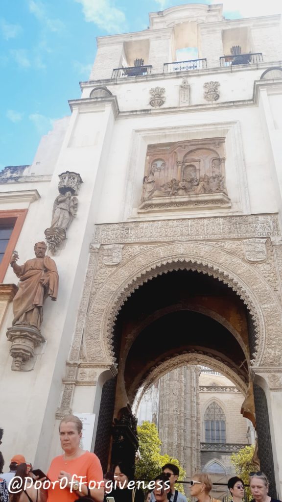Katedral Sevilla memiliki enam pintu utama dengan gaya arsitektur gotik dan renaisans, kecuali salah satu pintu yang merupakan gerbang asli masjid menuju area wudu. Gerbang itu masih mempertahankan ciri khas arsitektur Moor yang berbentuk lengkungan tapal kuda. Pada abad ke-16 gerbang tersebut dipercantik dengan elemen terracotta oleh pemahat Miguel Perrin. Setiap pintu gerbang di katedral memiliki nama, dan gerbang yang satu ini bernama Puerta del Perdón atau The Door of Forgiveness. Luar biasa, bekas gerbang masjid ini menyandang nama yang mengingatkan saya pada salah satu Asmaul Husna yang paling membuat saya terharu, yaitu “Yang Maha Pengampun.”