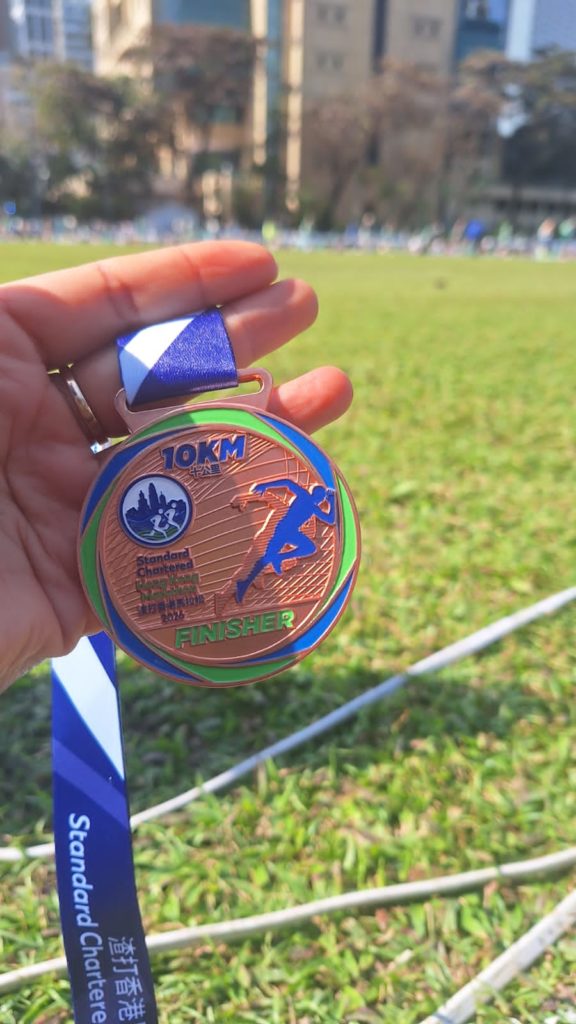 Beliau juga menuturkan ini merupakan pertama kalinya ikut lari marathon di Hong Kong, pengalaman pertama ikut lari marathon 10 KM dan bisa menyelesaikan sampai di garish finish dalam waktu 1 jam 30 menit, semua pelari yang sampai garis finish mendapatkan medal untuk lari 10 KM start nya di Island Eastern Corridor (IEC) East Bound near exit of Central – Wan Chai Bypass, jelasnya.