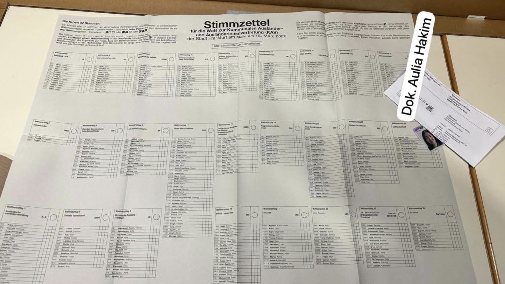 Halo Sobat Surat Dunia, pada hari Minggu tanggal 15 Maret 2026 Frankfurt am Main menyelenggarakan pemilihan Kommunale Ausländerinnen und Ausländervertretung (KAV). Pemilihan ini diperuntukkan bagi warga asing yang tinggal di Frankfurt untuk memilih perwakilan yang nantinya akan menyuarakan kepentingan komunitas migran di tingkat kota. Suara bisa diberikan dengan datang langsung ke TPS (Tempat pemungutan suara) atau melalui pos.